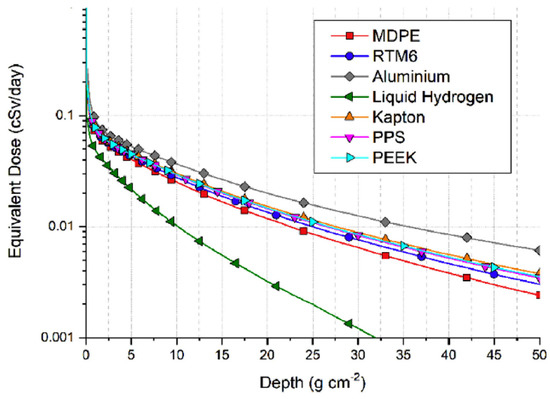- Laurenzi, S.; de Zanet, G.; Santonicola, M.G. Numerical Investigation of Radiation Shielding Properties of Polyethylene-Based Nanocomposite Materials in Different Space Environments. Acta Astronaut. 2020, 170, 530–538. [Google Scholar] [CrossRef]