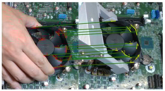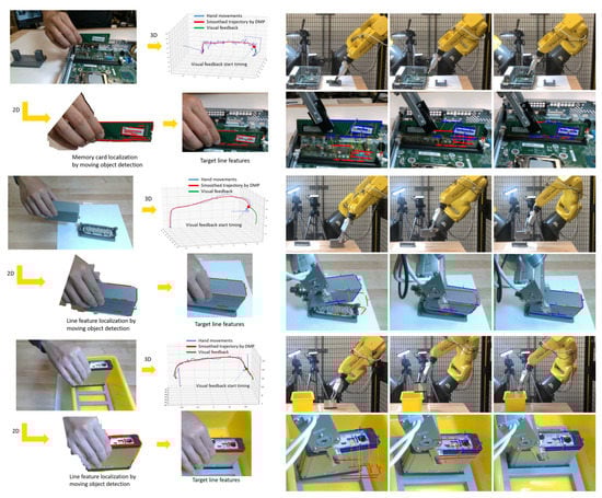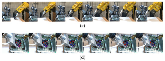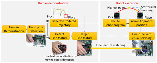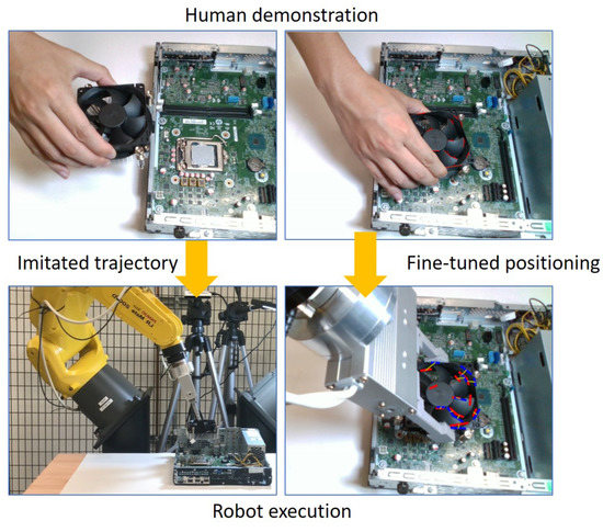 The initial position and the goal position of each task are changed in each trial to better evaluate the performance of the proposed approach. Figure 16 shows the entire process of the CPU fan installation experiment. Figure 17 shows the experiments of the other three tasks. Five trials are performed for each task, and we record the success rates in Table 1. As the baseline, the traditional visual servoing with our proposed line feature matching is used in the comparison. The results show our approach which integrates imitated and fine-tuned trajectories outperforms basic visual servoing. Compared to the visual servoing that often fails with collisions, the imitated trajectories generated from human demonstration significantly increase success rates, especially in complicated environments, such as computer assembly cases. The reinforcement learning-based method may achieve the same high precision as the proposed method. However, reinforcement learning requires a large number of trials that may take four hours to accomplish a connector insertion task [33], and the proposed method achieves a similar task by observing the demonstration only once. We still observed a failure during the experiments. The main reason is due to the collision while executing the visual servoing. Since lots of electronic components exist around the goal position in the computer assembly case, it is easy to collide with the surrounding components during the visual servoing if the displacement of each step is too large. To decrease the parameter of Equation (16) can obtain a shorter displacement to avoid the collision, but the side effect is that it may increase the cycle time.