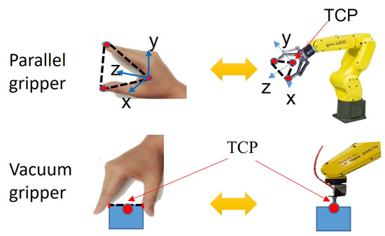 The hand gesture formed by the thumb and index fingers is used to mimic either parallel gripper or vacuum gripper, shown in Figure 3. From this hand gesture, both the robot grasping pose and the robot trajectories in Cartesian space can be generated by simply copying the demonstrator’s hand movements. To track the demonstrator’s hand movements, we train a convolutional neural network with the ResNet101 structure to infer 2D keypoints of the hand similar to [26] and then retrieve the depth value corresponding to the 2D keypoint pixels to calculate 3D coordinates of each hand keypoint.