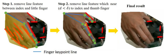 Since the demonstrator’s hand also moves together with the object during the demonstration, both the hand and the object are considered moving objects to be segmented by the moving object detection approach. Therefore, we further remove line features on the hand using the hand keypoints detection function described in Section 3.1.1. Figure 4 shows the process of how identifying the line features on the hand. First, all the line features between the index finger and the little finger are removed. Then, the distances between each line feature and finger keypoint line that the line segment between two hand joints are calculated. The distance between two line segments is defined in Figure 5. We use two constraints in the form of overlap and non-overlap to measure the distance similarity between lines. If the two lines overlap in 2D image space, which may intersect another line segment along a perpendicular vector, the maximum distance at each overlapping endpoint is measured. If the two correspondence lines do not overlap in 2D image space, the distance from the center of the two line segments is measured. If the measured distance is smaller than the threshold , we consider it belongs to hand and remove it. Finally, only the line features belonging to the object are collected and stored for visual servoing control in the robot execution phase.
