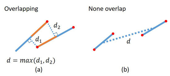 Line distance measurement between two line segments in a 2D image. (a) Overlapping case: Calculate the perpendicular distance between each overlapping endpoint and line segment, and take the maximum as the distance. (b) Non-overlapping case: Calculate the distance between the center point of each line segment.