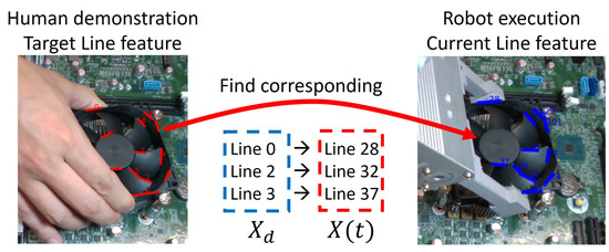In the robot execution phase, first, the robot moves to the goal position by following the imitated trajectories generated from the demonstrator’s hand movements. When the robot moves close to the goal position, the visual servoing control is triggered for precision placement. The line feature correspondences between the target image from the human demonstration and a current image of the robot execution are estimated using a novel line feature matching approach described in Section 3.2.2.