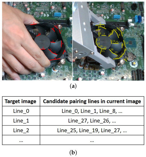where , denote the line direction vectors of a correspondence pair between target lines and current lines, and , denote correspondence points on the line pair which the direction vectors are , , respectively.