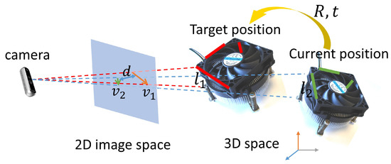 where is the normalized direction vector of the line in the current image, is the normalized direction vector of the corresponding line in the target image after being transformed with rotation R and translation t by Equation (7). are the endpoints of the line segments in the target image and the current image, are 3D positions corresponding to the 2D endpoints and . K is the camera intrinsic parameters and is the total number of line pairs respectively. Note the direction of all the line segments is normalized between .