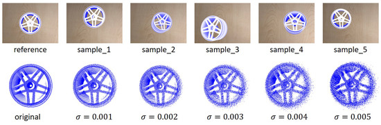 To evaluate the proposed line feature matching method, a dataset using the 3D CAD model from dataset MVTec ITODD [31] is created. 3D computer graphics software Blender [32] is used to render 2D images with different camera viewpoints. The object is transformed randomly as a rigid motion within the camera field of view, constraining the rotation as Euler angles in the range and the translation in the range [±50 mm, ±50 mm, ±50 mm] for obtaining 5 different patterns, as shown in Figure 11. Gaussian noise with zero means and standard deviation is added to the point cloud of the 3D CAD model. Five noisy level datasets that increase from to are generated for each pattern. The success rate of all found line pairs is defined as the evaluation metric used to compare to the ICL method.