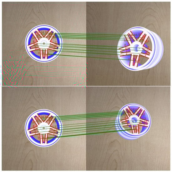 The third step is to re-pair all lines based on the obtained R and t, which transform lines in the target image to via Equation (7), as shown in Figure 9. The new line pairs are determined by measuring the similarities between and using the same method introduced in the first step. We take line and to be a new matched line pair if their similarity is less than the threshold . However, if the total number of matched line pairs is smaller than where N is the number of line pairs, the result of Step 2 may be unreliable. Then, the process loops back to the second step to calculate new R and t. Figure 10 shows the final result of the correspondence line segment between the target image and the current image. The full algorithm of the line feature matching is summarized in Algorithm 1.