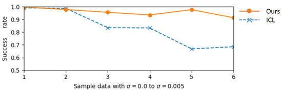 Figure 12 shows the results of the proposed line-matching method. The comparison result between ICL and the proposed method is shown in Figure 13. Both methods give good performance while the intensity of the Gaussian noise is small. However, the ICL method is highly affected by the noise level since the translation computation is only dependent on the accuracy of the 3D position of line segments. In contrast, the proposed method gives a higher success rate in most cases. This is thanks to the cost function that directly minimizes the errors in 2D space which reduces the depth noise impact.