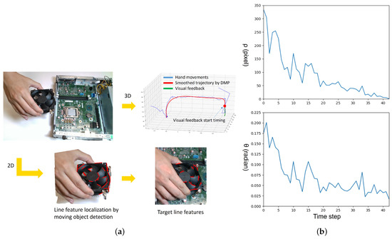 (a) CPU fan installation by human demonstration; From human demonstration, 3D imitated trajectories and 2D line features used for visual servoing are generated. (b) Line feature error () between target and current images converge to zero. (c) The robot executes a imitated trajectory generated from human demonstration. (d) The robot executes a fine-tuned trajectory through the use of visual servoing.