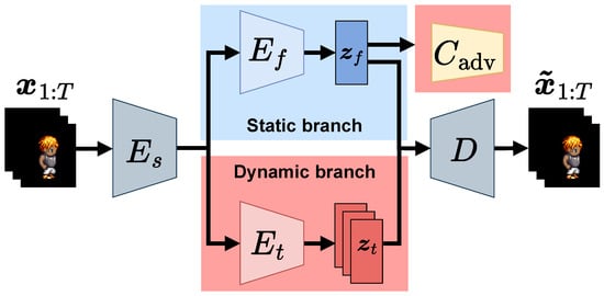 Overview of proposed model. The model consists of an auxiliary adversarial classifier , a decoder D, a shared encoder , a static encoder , and a dynamic encoder . and denote input and reconstructed videos, respectively, and and indicate static and dynamic latent variables, respectively.