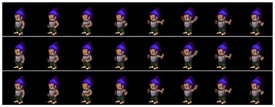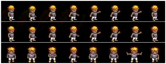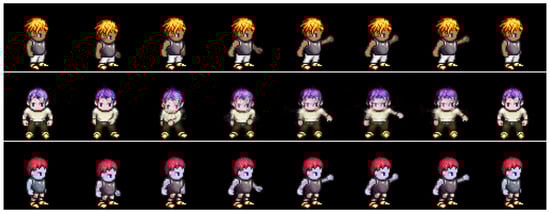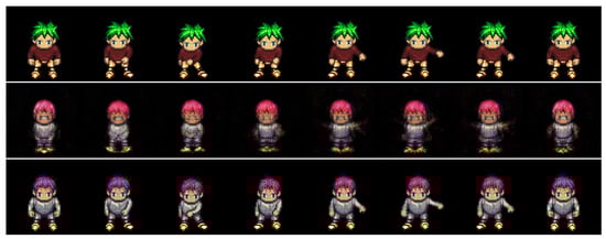 Example of randomly sampled generation on the Sprites dataset. We fixed the static variable and randomly sampled the dynamic variables. The top, middle, and bottom rows denote the input video and the results using DSVAE and the proposed method, respectively.