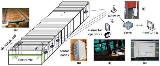 Proposed general system structure. (a) Image of the anodes and cathodes of an electrolytic cell. (b) Sensor–actuator node. (c) Gateway. (d) Operator removing a short circuit. (e) Monitoring of cell parameters trend with associated process disturbances.