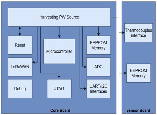 The hardware design consists of three main parts: (1) a power supply system, (2) a microcontroller and peripherals, including sensor interfaces, and (3) radio technology. Figure 2 shows the general block diagram of the hardware used for the sensor–actuator prototype node, consisting of two electronics-printed circuit boards: core and sensor board (SB). The system was optimized to require the deployment of as few nodes as possible. Thus, each sensor–actuator node is designed to manage up to four cells, which involves a trade-off between simplicity of the hardware design, power consumption, and duty cycle of the communication channel.