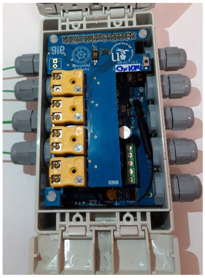The node is encapsulated in a waterproof polycarbonate container (151 × 80 × 60 mm) with high robustness and an IP68 protection rating. Cable glands are used as sealing and termination devices to ensure that the characteristics of the enclosure which the cable enters can be maintained adequately. Figure 4 shows the two boards installed inside the open enclosure.