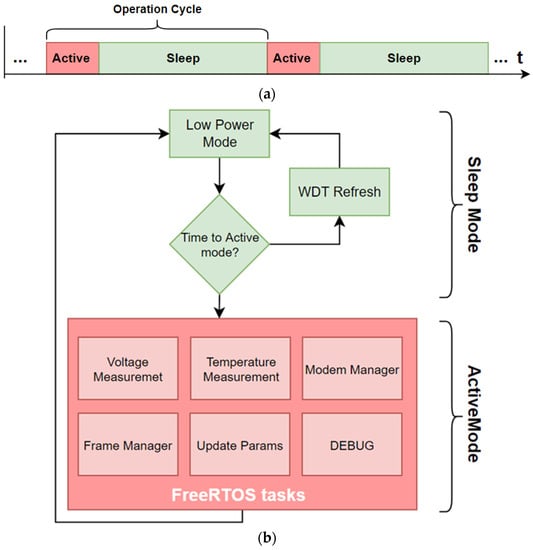 As it is detailed in this section, since the nodes perform several tasks that must be performed simultaneously, it is necessary to use an embedded real-time operating system such as FreeRTOS. In addition, the nodes, which monitor four cells and work independently from other nodes, have an operation cycle composed of two operating modes (Figure 5a): active mode, managed by FreeRTOS, where the running tasks are managed and prioritized by the operating system, and ultra-low power mode, which takes most of the duration of operation cycle (more than 95%), where only the temporary synchronization of the node and protection against unknown states are maintained through the WatchDog Timer (WDT).