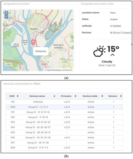 In addition to the 17 sensor devices deployed, the LoRaWAN gateway (Figure 9a) was installed at the center of the operations plant, where it was previously verified that the level of coverage generated by it in the rest of the plant was enough to guarantee wireless transmissions from the sensor nodes. Finally, both the system server and the screen that offers its graphical interface (Figure 9b) were deployed next to the gateway, since this is the most accessible point in the plant, which facilitated the system’s use by the operators and, therefore, maximized its use.