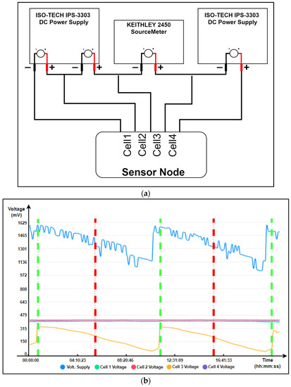 As seen in Figure 7b, both the voltages of each cell and the input to the source of the sensor device are shown; it also can be seen how the voltage of channels 1, 2, and 4 remains constant at 400 mV DC, while the power supply is between 1.6 V and 1.1 V. On the other hand, channel 3 shows a periodic cycle of 12 h, where the evolution of the voltage is similar to the process of generating a short circuit in a cell (decreasing voltage, from 350 mV to 50 mV with respect to the rest of the channels) and its removal by an operator (recovery of the original voltage).