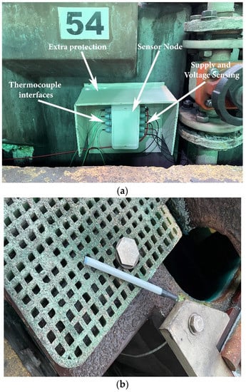 (a) Sensor node installed to cells at the Atlantic Copper factory (Huelva, Spain). (b) Thermocouple with protection capsule.