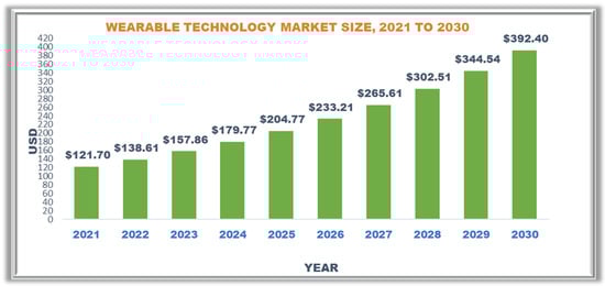 According to Frost and Sullivan [22], 5G combined with machine intelligence, data analytics, and the internet of things (IoT) could enable new ways to tailor diagnostic tests while lowering hospital visits and medical expenditures. They looked at smartphone-based saliva testing and blood glucose self-monitoring. The report Driving the Digital POCT Market reveals that digital point-of-care testing (POCT) systems are gaining traction. For quick screening of respiratory disorders and saliva sample-based diagnostics, more people are opting for self-monitoring. The COVID-19 outbreak and rise in diabetic patients are fueling the digital POCT market, which addresses distant testing requirements. With the advent of 5G, machine-based intelligence, data analytics, and the internet of things (IoT), new approaches to tailoring diagnostic testing while lowering hospital visits and medical expenditures are on the horizon [23]. Figure 3 depicts a wearable market growth forecast.