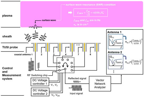 where is the electron density per cubic centimeter [3]. The vector network analyzer sweeps the f and simultaneously measures the reflection microwave frequency spectrum (S) over the f. The measured S has the dip, as shown in Figure 1, due to the strong electromagnetic wave confinement on the interface and absorption by the plasma at the SWR condition [12]. Thus, the electron density above the antenna 1 () can be estimated by using Equation (1). Then, the DC voltage controllers switch to the second antenna and the electron density above the antenna 2 () can be estimated with the same procedure. As a result, the whole estimation from the first and eighth antenna provides electron density uniformity.