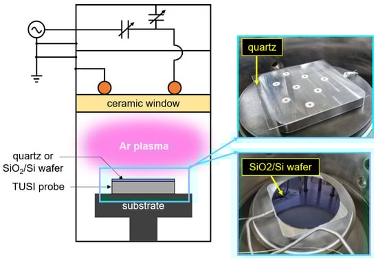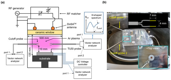 An inductively coupled plasma source was adopted to demonstrate the TUSI probe. Figure 3a shows a schematic diagram of the experiment setup. The ICP source has a two-turn antenna (DoSA, Plasmart Inc., Daejeon, Republic of Korea) [30] and an RF Matcher (Path Finder, Plasmart Inc., Daejeon, Republic of Korea). The chamber diameter was 500 mm and the substrate the TUSI probe puts on has a distance from the ceramic window of 135 mm. Argon gas of 23 standard cubic centimeter per minutes (sccm) was injected into the chamber via a mass flow controller (STEC SEC, Horiba Ltd., Kyoto, Japan), and an oil rotary pump (W2V40, WSA Co., Ltd., Daejeon, Republic of Korea) drew the gas inside the chamber, and then, the chamber pressure was maintained at 100 mTorr measured by a vacuum gauge (1 Torr Baratron, MKS Inc., Andover, MA, USA). An RF generator with 13.56 MHz (YSR-06MF, YOUNGSIN-RF Co., Ltd., Gyeonggi-do, Republic of Korea) applies the RF power to the DoSA antenna, and then, argon plasma is ignited and sustained.