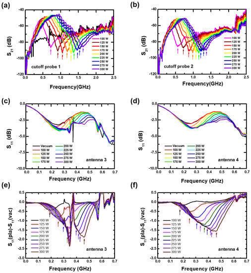 Figure 4c,d represent S spectra of antenna 3 and antenna 4, which were simultaneously measured with the cutoff probes. Both spectra show evident changes, depending on the RF power compared with the vacuum spectrum, but determining the dip is unclear. It might result from the perturbation by the cutoff probes above each antenna, since a clear peak was observed when the cutoff probes are removed, in the next section. In [12], converted S spectrum was introduced [12] for clear dip determination, which is defined as the difference between S spectra with plasma and at vacuum conditions, that is, S(pla)−S(vac). Here, we used this converted S method. Figure 4e,f show the converted S spectra where clear peaks marked as arrows emerge. As proved in [12], this peak results from the surface wave resonance and the frequency corresponds to the .