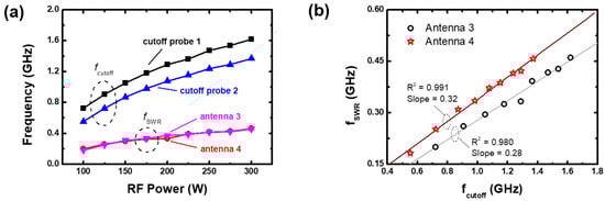 (a) Measured cutoff frequencies () and surface wave resonance frequencies () with various RF power from 100 to 300 W at pressure of 100 mTorr. (b) The plot as a function of the .