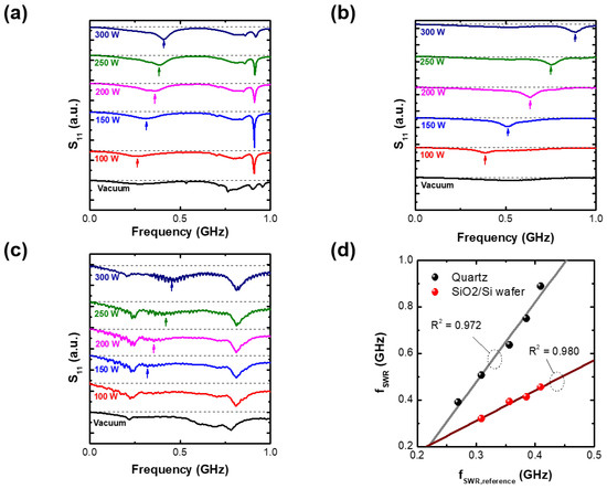 Figure 7a–c show the S spectra with various RF powers in the reference, quartz, and Si/SiO wafer cases. In the reference case, the S spectra show clear dip compared with the cutoff probe insertion case (Figure 4c,d). The shifts to a high frequency with increasing RF power.