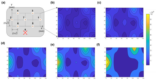 (a) Two-dimensional Cartesian coordinate and the antenna positions and numbers of the TUSI probe; the grid distance is 25 mm and inter-diagonal distance is 50 mm. Measured electron density distribution at the RF power of (b) 100 W, (c) 150 W, (d) 200 W, (e) 250 W, and (f) 300 W with the same z-scale from 10 cm to 2 × 10 cm. For clear visualization, the 2-dimensional linear-interpolation method with 50 intervals are adopted in (b–f). The RF8 malfunctions, so it is excluded.
