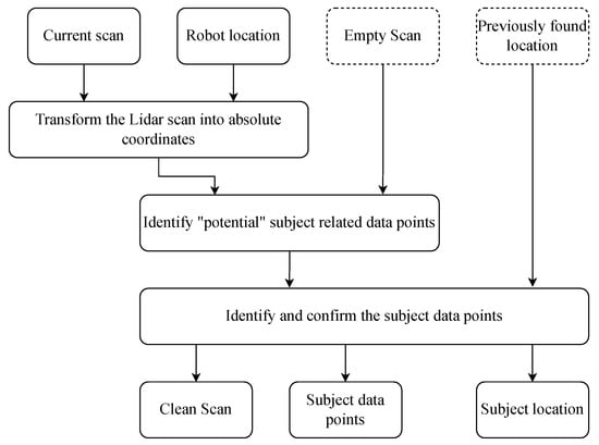 Afterwards, we use a slight alteration of the algorithm we previously proposed in [4] to clean the scan, discard noisy data points, identify the subject’s related data points, and derive their location. Algorithm 1 shows how this is peformed. The algorithm first compares the data points of the current scan to an empty scan taken when no person was in the room. The data points that are not within a range of to the ones of the empty scan are considered as newly found points and are saved in a separate list . The clustering algorithm DBSCAN [41] is used to find clusters of newly found points. Depending on the number of clusters and the potentially found location in the previous scans, the subject’s location is retrieved and is used to isolate the subject’s data points in the current scan.