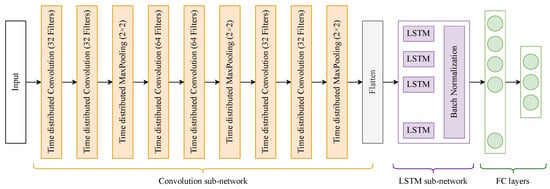 The first variation uses the neural network architecture shown in Figure 4. It consists of a single time-distributed convolution with 32 filters whose size is 3 × 3, followed by a time-distributed 2 × 2 max pooling layer. The output of the max pooling layer is flattened and fed to the LSTM layer, which has 40 cells. The LSTM output is connected to 2 fully connected layers that have, respectively, 100 and neurons. represents the total number of classes of activities.