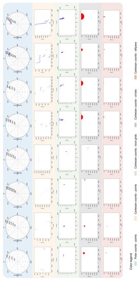 - Lidar location during the scenario: This is interpolated in a way where a pair of coordinates is generated every time a scan is generated; that is, the location of the Lidar is reported alongside with each individual scan. This is a set . The Lidar location is supposed to be known at any given moment, as the robot is expected to be self-aware of its position within the house/room for cleaning purposes.