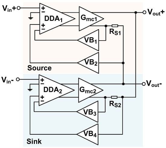 Figure 3 shows the schematic of the current driver. It consists of two identical sub-drivers to generate a balanced output. One is used for sinking current, and the other is used for sourcing current. This configuration can reject the common-mode (CM) voltage across the load caused by the mismatch in the transconductor (Gmc1,2) and sensing resistors (RS1,S2). Each sub-driver consists of a differential difference amplifier (DDA1,2) followed by the transconductor, which performs the voltage-to-current conversion. The RS1,S2 is used to monitor the output current, and the voltage across the resistor is fed back to the DDA1,2 through a pair of voltage buffers (VB1,2 and VB3,4), forming a negative-feedback loop. To accommodate a wide output swing, the buffers are designed to achieve a rail-to-rail output [11].