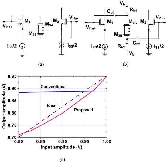 Figure 4b shows the proposed approach where the control voltage of M3A,3B is provided by voltage Vb through a resistor Rb1,b2. This method allows the source degeneration to be controlled independently of the input level. Additionally, the gate of M3A,3B is connected to the input terminal through a small capacitor Cb1,b2, which allows tracking of the input variations. When the input (Vi1a+, Vi1a−) changes, Cb1,b2 senses the voltage and converts it to current. Then, the current charging the gate capacitance of M3A,3B creates the control voltage, which modulates the on-resistance for source degeneration. Figure 4c shows the comparison of the transfer characteristic obtained using the output and input signal amplitudes, which indicates the improved linearity of the proposed approach.