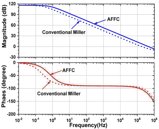 Comparison of the open-loop gain of the amplifier using AFFC and traditional Miller compensation.