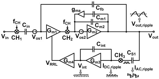 Figure 10 shows the comparison of the open-loop gain of the amplifier using AFFC and conventional Miller compensation. The bandwidth is extended by the LHP zero available in the AFFC. The PM is reduced from 82.2° to 60°; it guarantees stable operation. Figure 11 explains the operation of the RRL, and its implementation is similar to the previous work [21]. The process variation creates offsets. Gm1 and Gm2 are associated with the offset voltages VOS1 and VOS2, respectively. The VOS2 is not chopped but suppressed by the open-loop gain (AOL1) of the preceding stage (Gm1). Therefore, the input-referred offset can be written as (VOS1 + VOS2/AOL1). The system offset amplified by Gm1 creates the offset current. The current is up-converted to fCH by CH2, and integrated by Gm2 and Cm2, producing the output ripple Vout,ripple. At the output, a sense capacitor CS1 converts Vout,ripple to a current IAC,ripple. The current demodulated by the chopper CH3 is converted to IDC,ripple. The current integrated by Gm3 and Cint generates the integrator output Vint, which is converted to the voltage VRRL by Gm4. To cancel the offset current generated by VOS, the VRRL is input to Gm1.