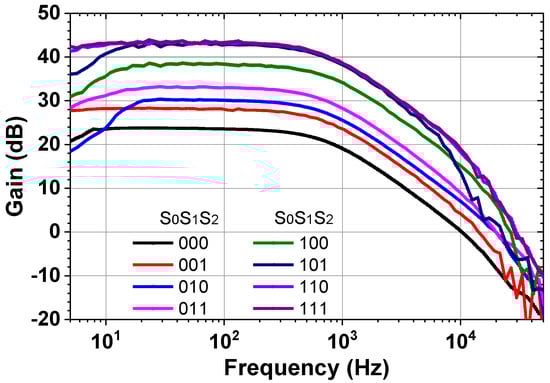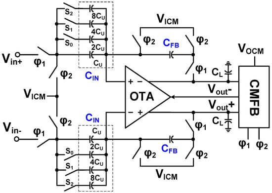 where AOL is the open-loop gain of the OTA. The feedback capacitor is given by CFB = CU = 100 fF. The CIN is the capacitor sum connected to the input, which is determined by closed switches (S0–S2). The ACL is variable from 1 to 15 (v/v) by controlling the three switches.