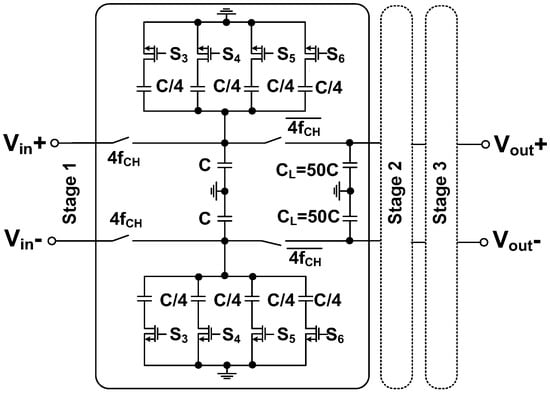 Figure 15 shows the schematic of the LPF. Using the unit capacitor C = 100 fF, the states of the switches (S3–S6) determine the cutoff frequency. The number of SC stages determines the order of the filter. Figure 16 shows the simulated frequency responses of the LPFs. The ECG channel uses the first-order LPF to set the cutoff frequency close to 1.5 kHz. The IMP and BP channels use the second and third-order LPF to set the cutoff frequency at 60 Hz and 50 Hz, respectively.