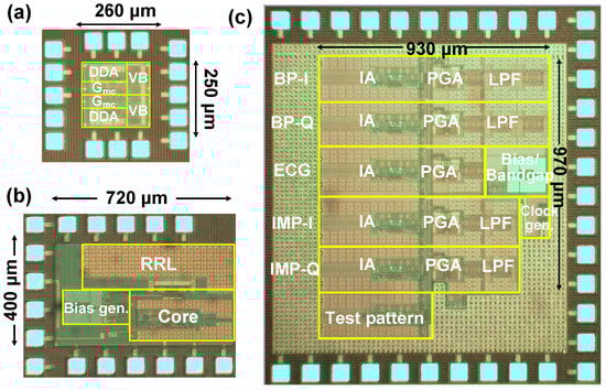 Microphotograph of (a) current driver, (b) preamplifier, (c) back-end signal processing IC.