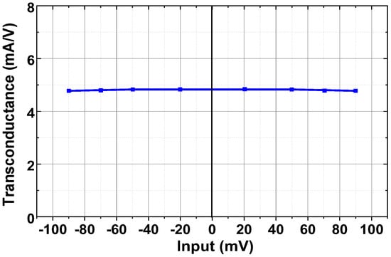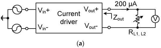 Figure 18 shows the measured transconductances of the current driver at 10 kHz using a load of (1 kΩ || 20 pF). The transconductance is relatively constant over the input range from −90 mV to +90 mV. Figure 19a shows the schematic of characterizing the output impedance ZOUT of the current driver. The differential input of the driver is generated using the Keysight 33500B with a high stability time base option. The output current is set to 200 μA by adjusting the input. The ZOUT value is obtained using two resistances (RL1 = 100 Ω, RL2 = 4.7 kΩ) and recording the change in the output voltage. The magnitude of ZOUT can be expressed as