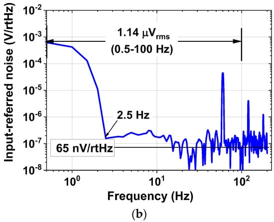 Figure 20a shows the gain response (single-ended) of the preamplifier measured using a Keysight 35670A signal analyzer. The mid-band gain is 39.4 dB (differential) at 100 Hz by consuming 0.56 μA (including bias circuit) from VDD = 1.8 V. The mid-band common-mode rejection ratio (CMRR) and power-supply rejection ratio (PSRR) are 61 dB and 66 dB, respectively. Figure 20b shows the measured noise spectral density using fCH = 2 kHz. The input noise voltage density is 65 nV/√Hz with a 1/f corner frequency of 2.5 Hz. The integrated noise from 0.5 to 100 Hz is 1.14 μVrms.