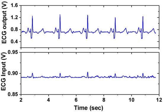 Next, we present the measured result of BE signal processing IC. Figure 21 shows the measured gain control of the ECG channel. When all the switches of the PGA are in the OFF state, the mid-band gain is 20 dB. When all the switches are in the ON state, the PGA gain is 23 dB, which leads to an overall gain of 43 dB. Figure 22 shows the input noise density of the ECG channel measured using 40 dB gain by consuming 0.4 μA at 1.8 V. When the chopper is turned on, 1/f noise is effectively suppressed, resulting in a corner frequency of 2 Hz and noise density of 70 nV/√Hz. Figure 23 shows the amplified ECG signal for the input cardiac signal having Vpp = 12 mV (differential), generated from a function generator Keysight 33500B. The output shows Vpp = 600 mV (single-ended), indicating a 40 dB gain.