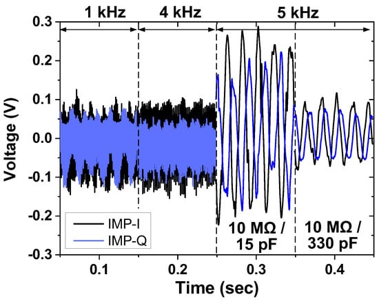Measured result of the impedance channel. The current driver injects input at three frequencies (1 kHz, 4 kHz, and 5 kHz). The demodulation is performed at 5 kHz.