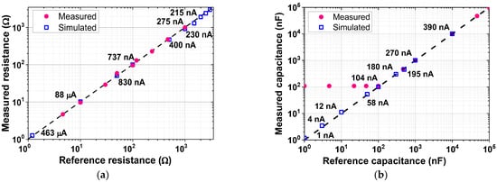 Figure 24 shows the measured results of the in-phase and quadrature IMP channels. The result is obtained by injecting current at three frequencies (fAC = 1, 4, and 5 kHz). The baseband output is observed when the demodulation chopper frequency is set to 5 kHz. The measured waveforms show that the output amplitude decreases with the increase in the capacitance value from 15 to 330 pF. Figure 25 shows the measured range of the ETI system. A resistor and a capacitor under the test are connected between the inputs of two AEs. When we use a sinusoidal current of 88 μApp at 1 kHz, the detection range using 69 dB channel gain is from 100 mΩ to 120 Ω. When the injected current is reduced to 215 nApp with the minimum PGA gain setting, the maximum range can be extended to 3 kΩ. The minimum range is extended to 10 mΩ using the maximum PGA gain. The simulated results agree well with the value of the reference resistance over the range. In the case of capacitance, the detection of the minimum value is limited by the parasitics of wiring capacitance in the test board. The measured linear range of capacitance is from 100 nF to 100 μF.