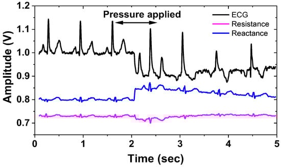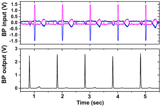 Figure 26 shows the measured results of the BP channels using a gain of 43 dB, fCH = 2 kHz, and ∆f = 50 Hz. The input cardiac signal having Vpp = 20 mV is generated using a function generator. Figure 27 shows the measured waveforms of the ECG and IMP channels. The electrodes attached to the wrists are connected to the current driver. A differential current of 303 μApp is injected into the electrode. Other sets of electrodes are connected between the body and test boards (AE and BE), thus amplifying the biopotential signal using 45 dB gain. The environmental noise is suppressed using a filtering function of the Keysight MSO-X oscilloscope. The motion artifact is induced by applying a hard push to the electrode. The result shows a successful operation of the proposed ETI system in vivo, where the ECG signals are measured while ETI is monitored.