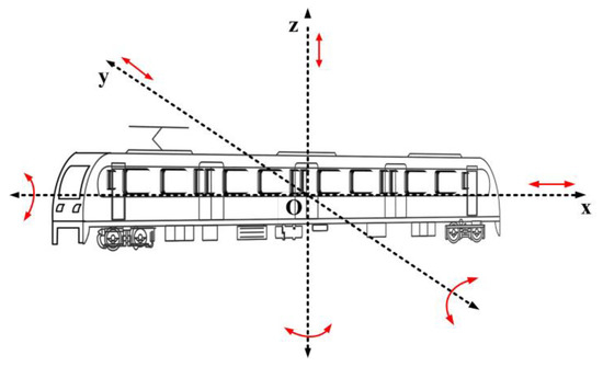 Random vibration occurs during the operation of urban rail vehicles due to wheel–rail interaction caused by uneven track. The vibration of the vehicle body may relatively displace the layers of the IGBT module in the traction converter. The severe vibration will even cause the module to bend and the distribution parameters to change, which eventually causes the fatigue failure of the IGBT module. The form of the train vibration is shown in Figure 2. The vehicle body is placed in a Cartesian coordinate system, where the vehicle body is parallel to the x-axis and the center of gravity of the vehicle body is located at the coordinate origin O.
