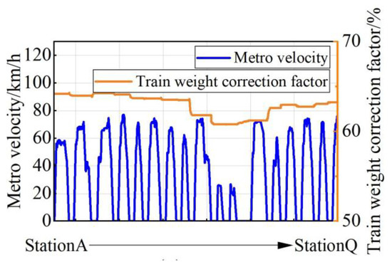 In this paper, the variation curves of the train speed and the train weight correction factor between each station are obtained by simulating the actual train operation curve, as shown in Figure 7. It can be seen that a total of 17 stations are included, and the speed is limited to below 80 km/h. The change in the vehicle weight correction factor reflects the increase or decrease in vehicle personnel. During the operation of the vehicle between the 17 stations, the speed and load conditions between two stations have differences, such as the lowest speed and the load during the arrival of the train at the end of the line; the speed is relatively high during the operation, and the load will change with the change in personnel.
