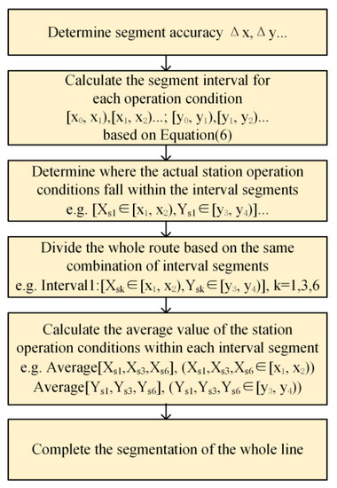 The flow chart of the whole line OIS is shown in Figure 9. In the process of segmenting the whole line, it is first necessary to determine the segmentation accuracy (segmentation criteria). The second step is to calculate all interval ranges corresponding to the segmentation accuracy and the actual operation conditions. The mathematical model for determining the range of all segment intervals corresponding to the operating conditions is given by Equation (6). The third step is to determine the interval range corresponding to the operation condition values [Xsk,Ysk] for each station, forming the interval range combination for each station, where k is the station sequence number. In the fourth step, the stations of the same interval range combination Cs are used as a segment interval (Interval l) in the whole line, where l is the segment interval sequence number of the line Interval l. The fifth step is to calculate the average value of each type of operating condition for each segment interval. Finally, once the number of segment intervals and the corresponding operation condition values have been determined, the whole line segmentation can be achieved.