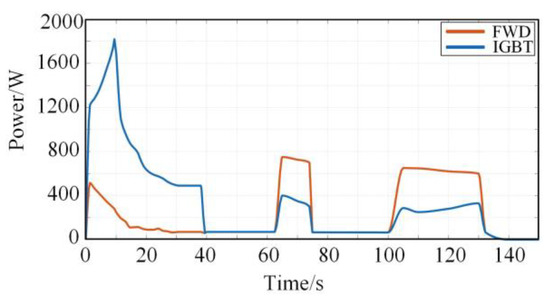 It is observed from Figure 10 that the power loss of the IGBT is higher than that of the FWD in the train traction phase. Furthermore, the power loss of the IGBT in the braking phase is lower than that of the FWD because the current is mainly distributed in the FWD during the braking phase. Therefore, the thermal stress generated by the power loss of the FWD may also accelerate the fatigue of the IGBT module’s internal material.