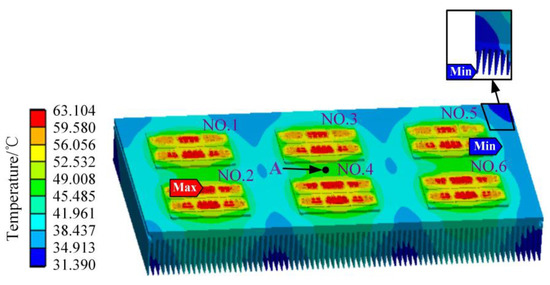 The simulation results of the temperature field of the IGBT module and heat-sink in the traction converter are shown in Figure 11. The highest temperature of the whole model is 63.104 °C, which is located in the middle chip of the No. 2 IGBT module, and the heat is mainly concentrated on the chip and the bonding wire, and the lowest temperature is 31.39 °C at the fin at the edge of the heat-sink. For each IGBT module, the temperature distribution trend gradually decreases from the center to the surrounding, and the corner of the IGBT module has the lowest temperature. For the chips of the IGBT module, the high-temperature area of the chips in the middle position is large, while the high-temperature area of the chips on both sides is small, and the closer to the edge, the lower the temperature. Most of the heat is vertically transferred from each chip to the IGBT module substrate and presents a downward decreasing transfer trend.