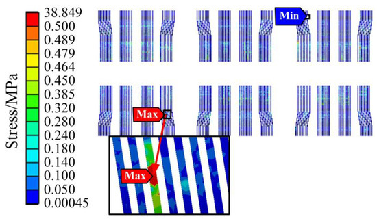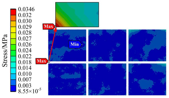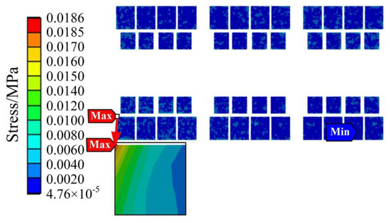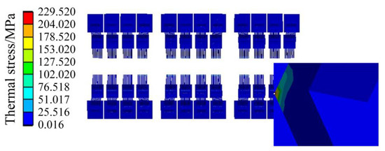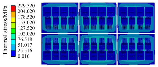The thermal stress results of the IGBT module are shown in Figure 12 and Figure 13. Figure 12 shows the thermal stress of the liner unit and above position, and Figure 13 shows the thermal stress of the chip unit. As shown in Figure 12, the stress of the copper layer gradually decreases from the center to the periphery, which is the same as the distribution trend of the temperature field, indicating that the temperature distribution affects the stress distribution to a certain extent.